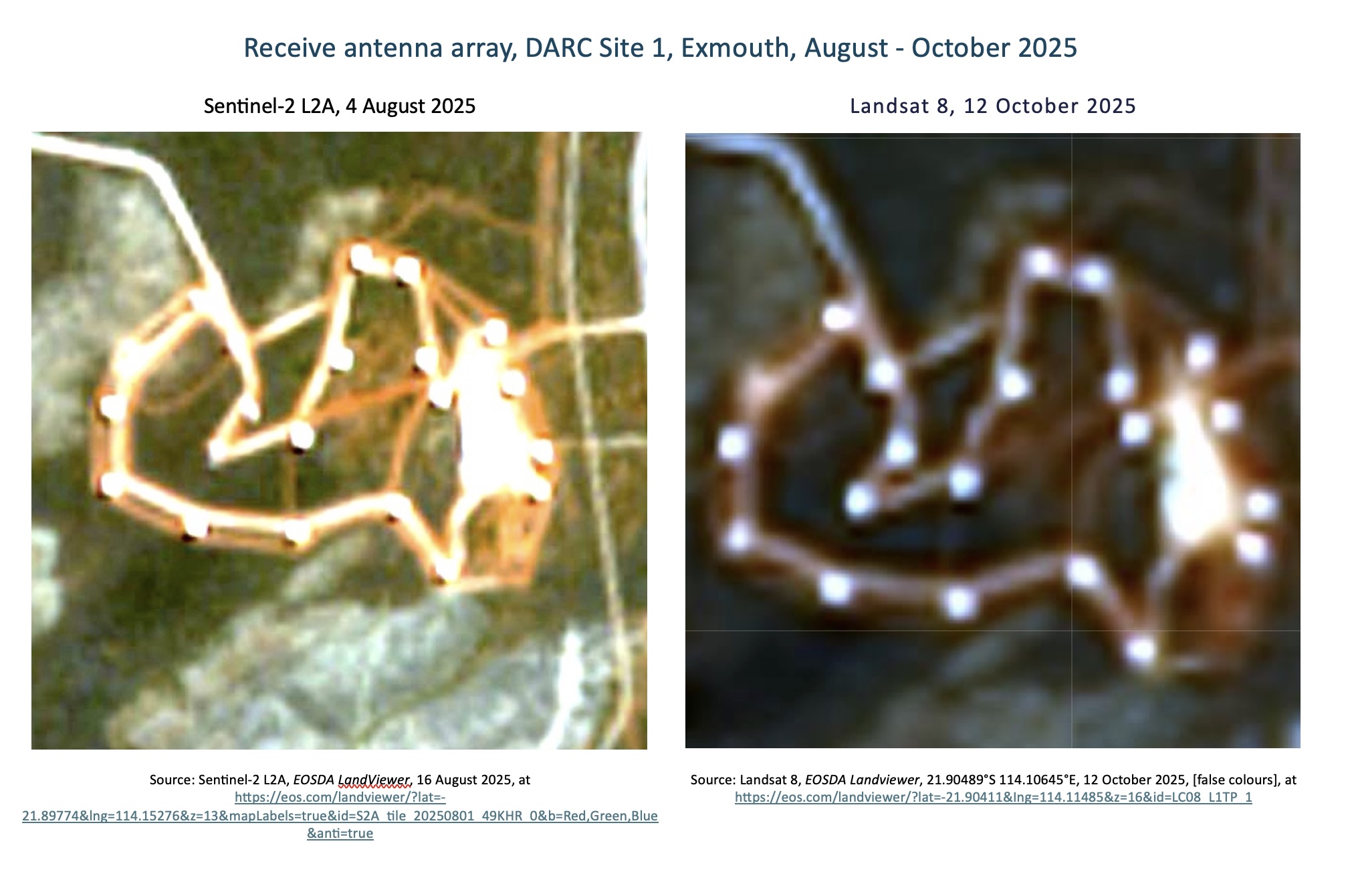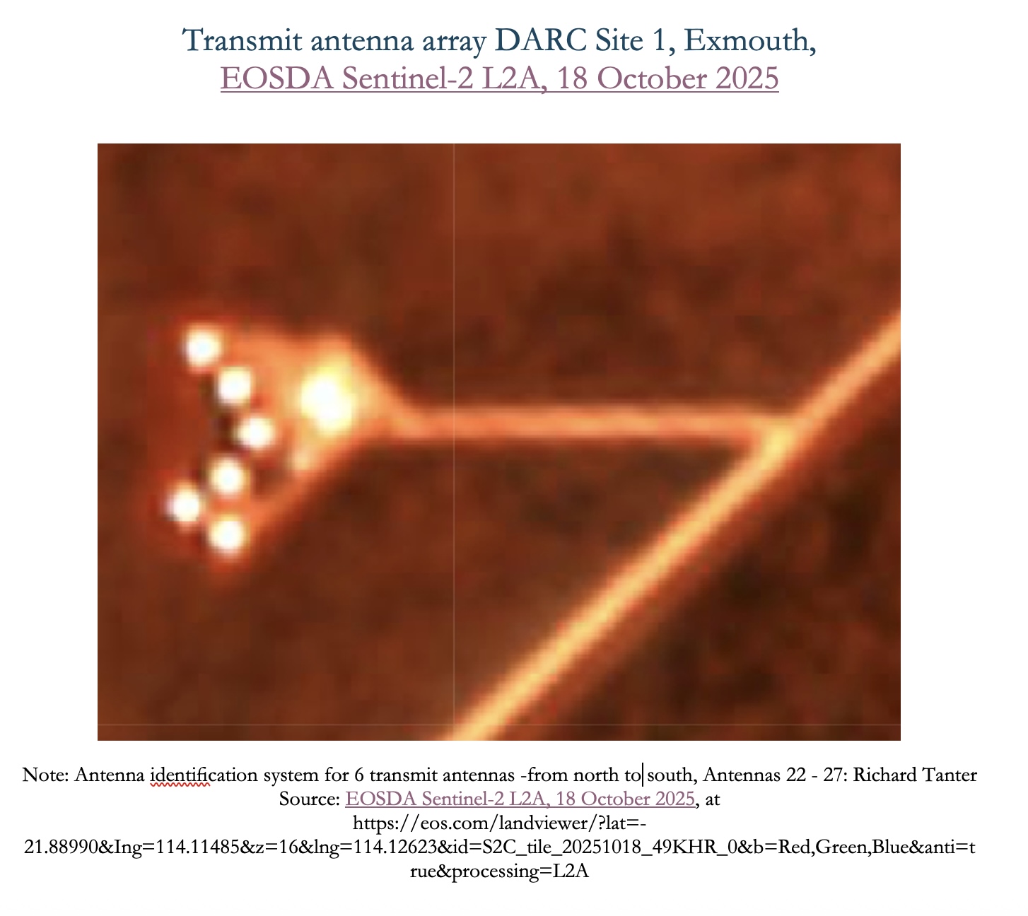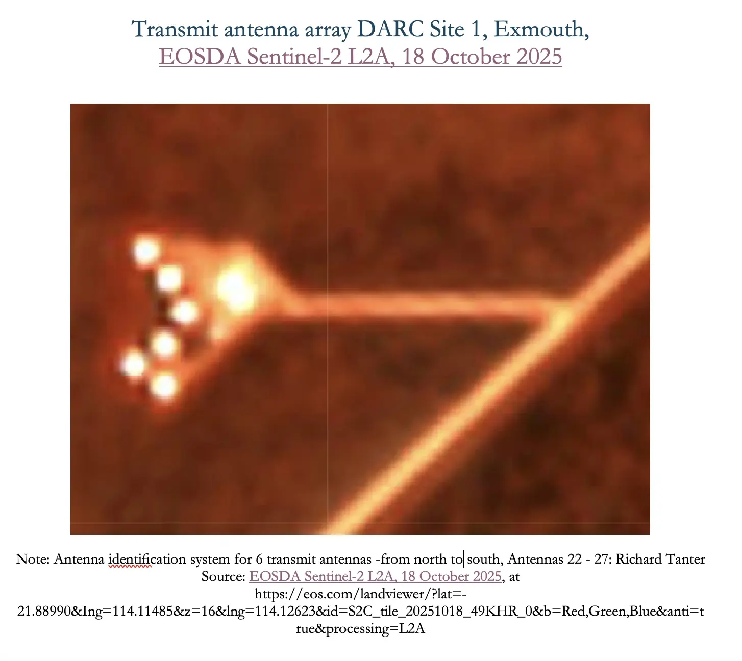 The following figure depicting the receive array uses US Space Force imagery from 19 February 2025 depicting 21 antennas in place as the basis of a preliminary antenna identification system.