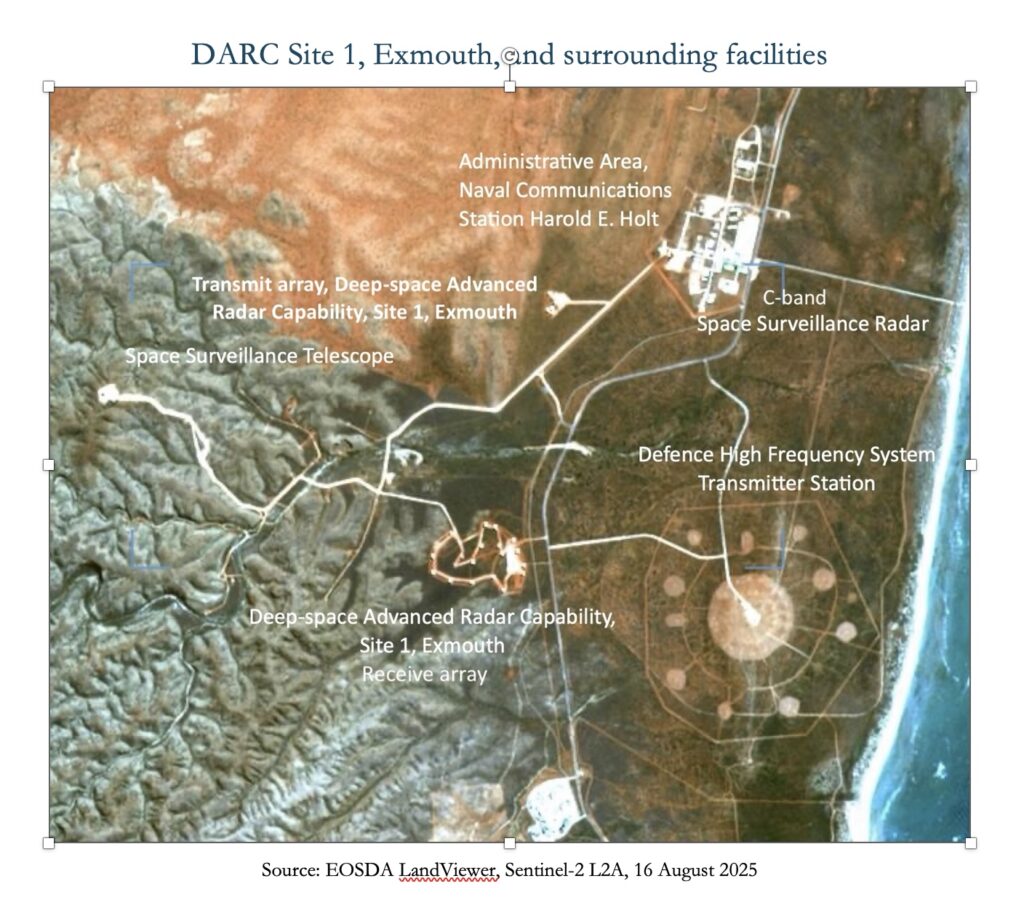 DARC Site 1 is located on the northern part of the Exmouth Peninsula in Western Australia, between the small town of Exmouth to the south and the huge Very Low Frequency antenna towers of the Naval Communications Station Harold E. Holt on the northern tip of the peninsula, North West Cape. The DARC facility sits in a cluster of major electronic military facilities that personify the contemporary level of integration between Australia and United States defence facilities and operations. The DARPA-designed US-built Space Surveillance Telescope is a few kilometers to the northwest of the DARC array. To the east next to the waters of the Exmouth Gulf is the transmitter station for the ADF’s Enhanced Defence High Frequency System Exmouth facility in a circular array half a kilometer in diameter. A few kilometers northeast of DARC the US-built Space Surveillance Telescope is located on the southeast corner of the administrative area of the Naval Communications Station.