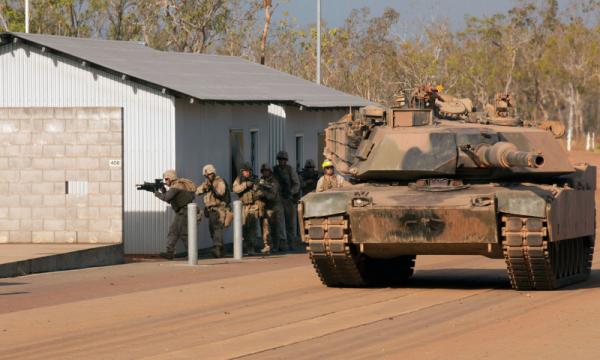 Marines were positioned and camouflaged throughout a tree line. They waited patiently for their Australian partners to arrive before executing an assault at the urban operations training facility at Mount Bundy Training Area, Northern Territory, Australia, Sept. 5. The roar of massive M1A1 tank engines echoed between the walls of the training facility as the machines rolled down the dirt road and past the first two buildings. Their job was to provide cover fire and support while Marines rushed into each building and cleared it while taking simulated enemy fire from role-players.