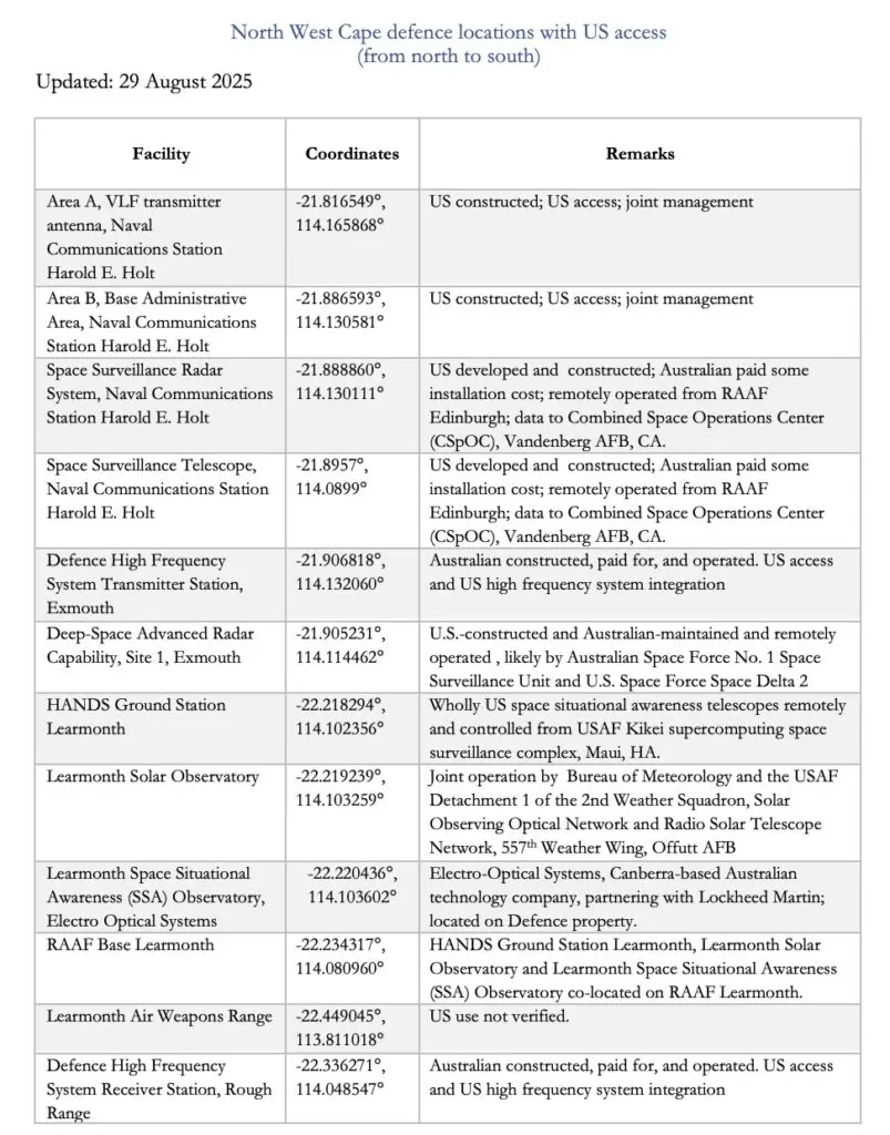 Of course, there are differences of degree as to which military and intelligence bases on Australian soil can be appropriately regarded as ‘joint facilities. If you like, there are degrees of ‘jointness’. The Australian government has only specifically identified three bases as joint facilities: the Joint Defence Facility Pine Gap, the US Air Force operated nuclear detonation seismic monitoring network at the Joint Geological and Geophysical Research Station, and the HANDS (High Accuracy Network Determination System) Ground Station Learmonth on North West Cape. The Australian government has never provided a full and accurate list of joint facilities, but the statements identifying the three just mentioned imply that there are others, as is certainly the case.