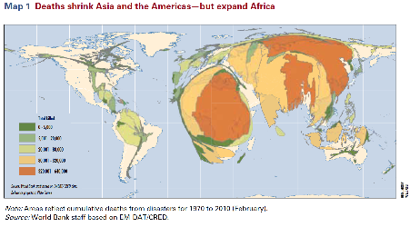 This is not surprising. As the below maps from a World Bank publication show, disasters in rich countries cause property damage rather than loss of life. It is the opposite in the developing countries.