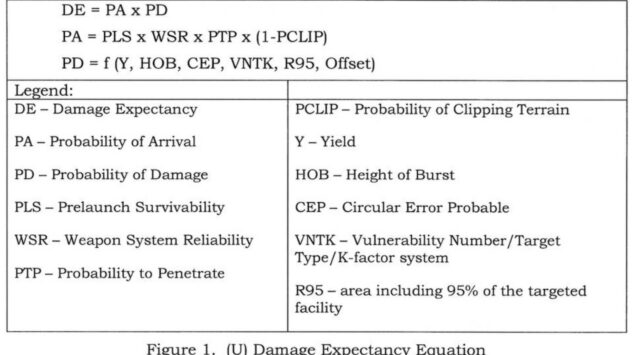 These planning factors feed into Damage Expectancy (DE), the central measure of effects in OPLAN assessment. DE is defined as “the probability of achieving the desired level of damage against a targeted facility.”[15] The instruction formulates Damage Expectancy algebraically as follows: