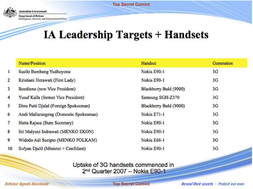 The third and most damaging revelation came two weeks later, when on November 18 the Australian Broadcasting Corporation and The Guardian Australia released a set of six more documents from the Snowden collection.[vii] This time, while the documents were downloaded by Snowden from the NSA, they consisted of six PPT slides produced by its Australian partner, DSD, explaining its achievements in monitoring and intercepting 3G cell phone communications amongst ‘Indonesian leadership targets’, apparently commencing in ‘2nd quarter 2007’.[viii] Stunningly, the slide listed the top ten targets and their phone types, starting with President Susilo Bambang Yuhoyono; his wife; Vice-President Boediono; the preceding Vice-President Yusuf Kalla; and six of Yudhoyono’s most senior ministers and closest advisors.[ix] Other slides portrayed ‘intercepts events’ of Yudhoyono’s phone, and made clear that this was a model DSD was keen to apply elsewhere.