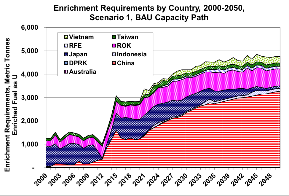 - “National Enrichment, National Reprocessing”: In this scenario the major current nuclear energy users in East Asia (Japan, China, and the ROK) each pursue their own enrichment and reprocessing programs, with all required enrichment in those countries accomplished domestically by 2025 or 2030. Other countries may also pursue domestic enrichment, though this scenario assumes that other countries import enrichment services through 2050. Reprocessing, using 80, 60, and 50 percent of spent fuel (SF) in Japan, the ROK, and China, respectively, is in place in Japan by 2020, and in ROK/China by 2030 Nuclear fuel is assumed to be fabricated where uranium is enriched and/or fuel is reprocessed. Half of the reactors in Japan, China, and ROK eventually use 20% mixed oxide fuel (fuel including mixed uranium and plutonium oxides, or MOx), but MOx use starts earlier in Japan than in the other nations. Japan and the ROK import uranium; other nations in the region eventually produce half of their U needs domestically except Australia, which produces all of its needs, and the Russian Far East, which imports all of its modest needs from elsewhere in Russia. Arrangements for disposal of high-level nuclear wastes from reprocessing would be up to each individual country, with attendant political and social issues in each nation. Security would be up to the individual country, and as a result, transparency in the actions of each country is not a given. Disposal of spent fuel and of high-level nuclear wastes from reprocessing is assumed to be carried out in each individual country, with interim storage or dry cask storage use assumed through 2050.