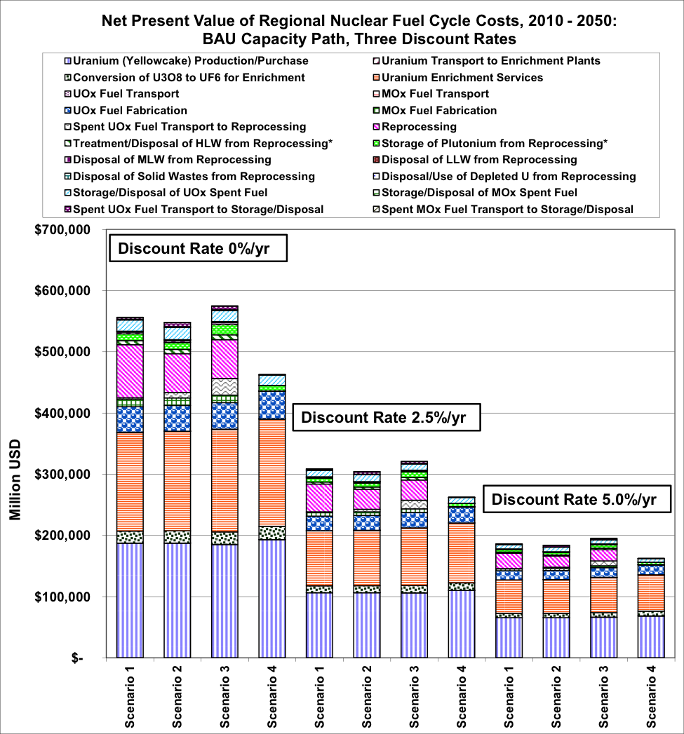 Overall, the conclusion from the above—similar to the conclusion that a number of other researchers have reached using per-unit costs (not from regional scenarios), is that reprocessing of spent fuel results in much higher costs—higher by on the order of $4 billion per year or more (about 20 percent), region-wide, in 2050—than using dry-cask storage and avoiding reprocessing of spent fuel, as shown in Figure 7. Figure 8 shows net present value costs from 2010 through 2050 (calculated with three different discount rates) for the nuclear fuel cycle elements. Scenario 1 through 3 yields total costs that about 14 to 19 (at a discount rate of 5.0 percent/yr) to 19 to 23 percent (at a zero discount rate) higher overall than in the least expensive scenario (Scenario 4). The absolute cost difference between scenarios declines somewhat as the discount rate used increases. Results at three different real discount rates are shown to reflect a range of potential perspectives as to the time value of money in nuclear investments. Present interest rates in Japan, for example, are near zero. In addition, one could argue that as investments with decidedly intergenerational implications, nuclear fuel cycle costs should be evaluated with a near-zero, zero, or even negative discount rate (see, for example, Hellweg et al, 2003).