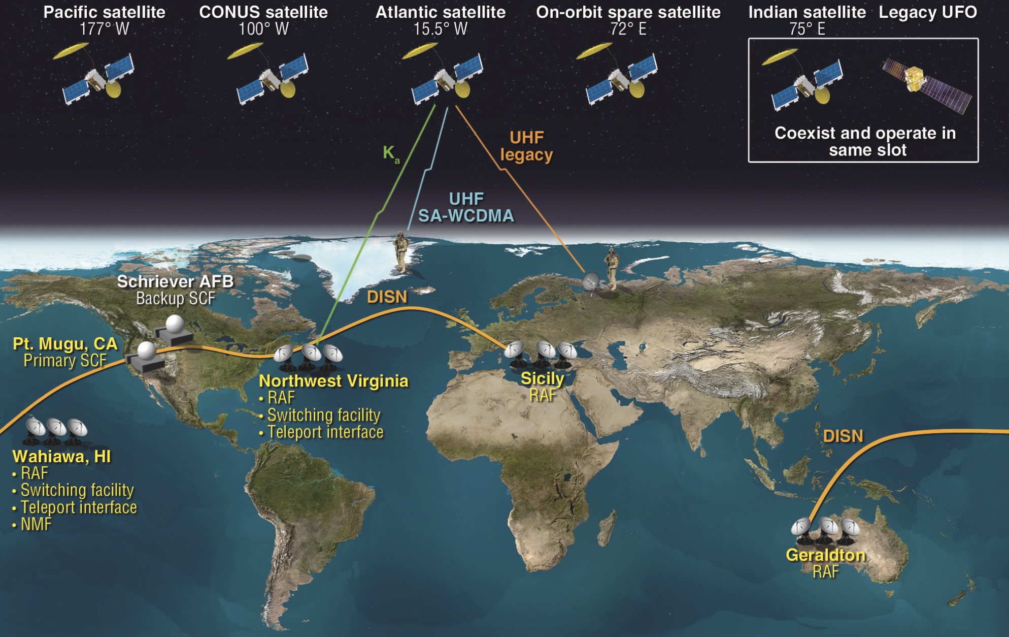 Note the thick orange lines denote high-capacity fiber optic terrestrial links connecting the Radio Access Facilities and enabling routing of data to either the Defense Information Systems Network (DISN) or to the most appropriate of the four Radio Access Facilities to link to one or more satellites.