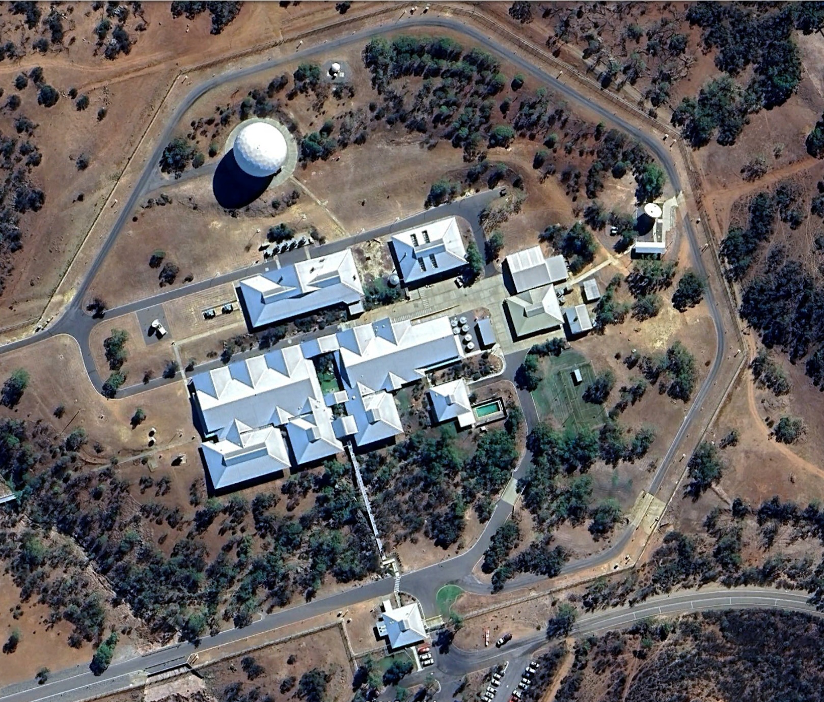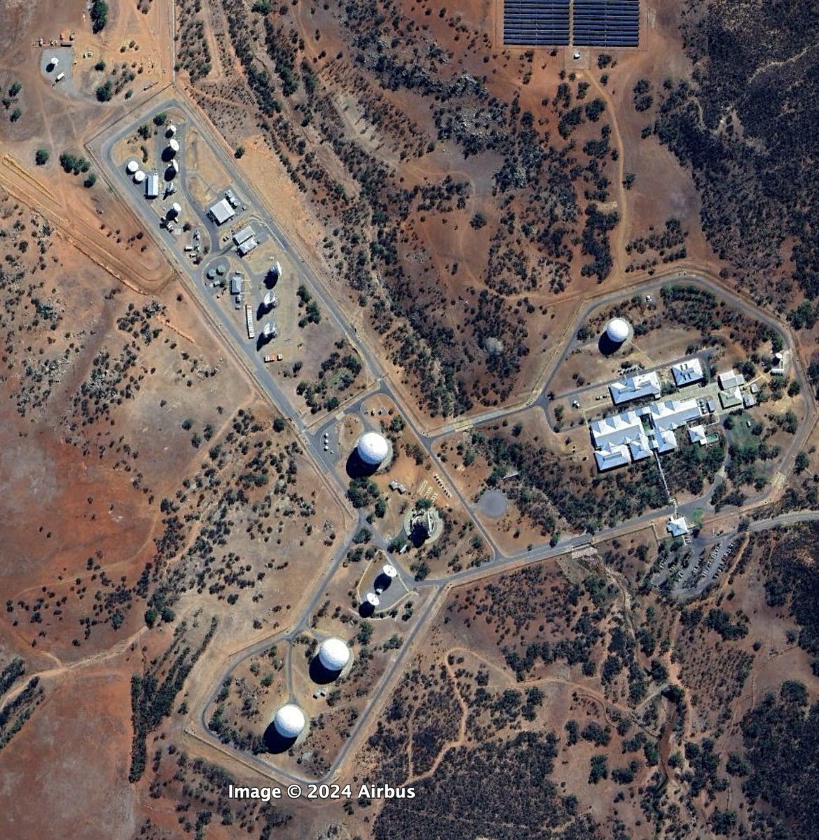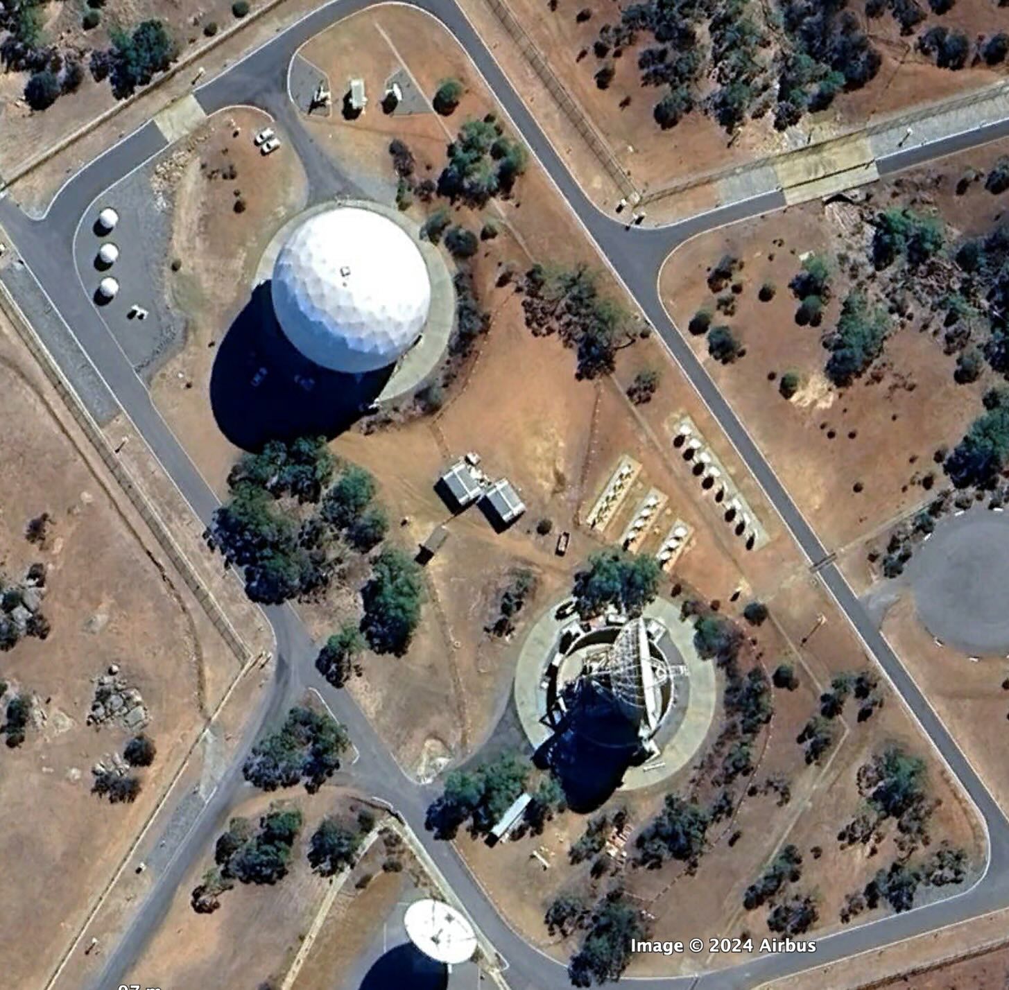 Australian Satellite Communications Station, Kojarena, Google Earth, 11 April 2024, including the Australian Satellite Communications Station satellite communications interception facility (right and lower), and northern compound containing MUOS Radio Access Facility, Satellite Ground Station – West, and Wideband Global System Ground Station, Google Earth, 11 April 2024