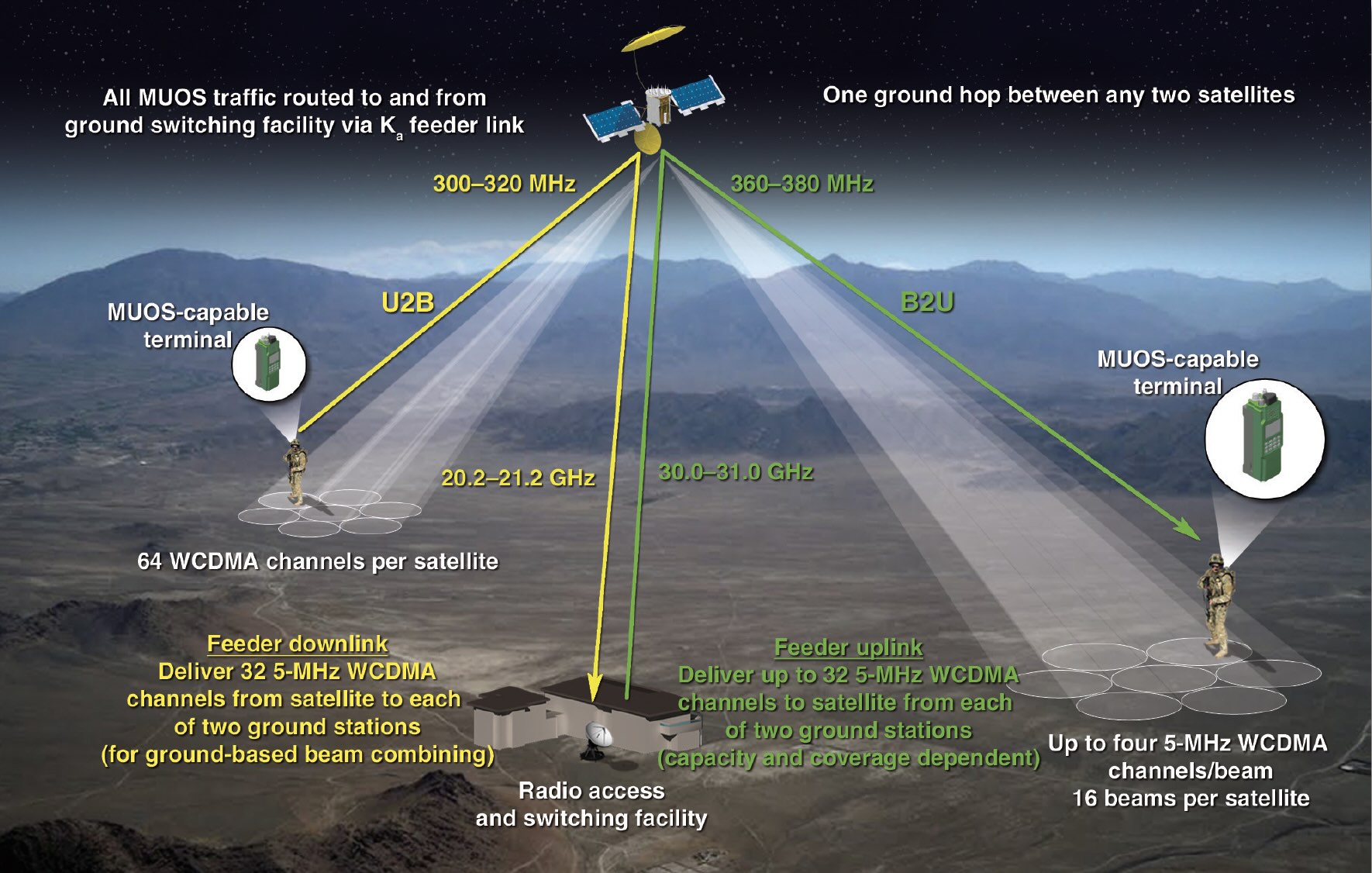 MUOS terminals – ruggedized military smart phones capable of secure worldwide voice and data links, including internet protocol links to military databanks and computing systems – uplink and downlink to the satellites in Ultra High Frequency (UHF). The satellites link to the Radio Access Facilities by Ka-band links.
